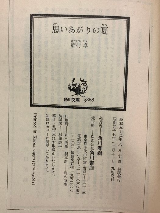 思いあがりの夏 角川文庫 緑 357-10 KADOKAWA 眉村 卓