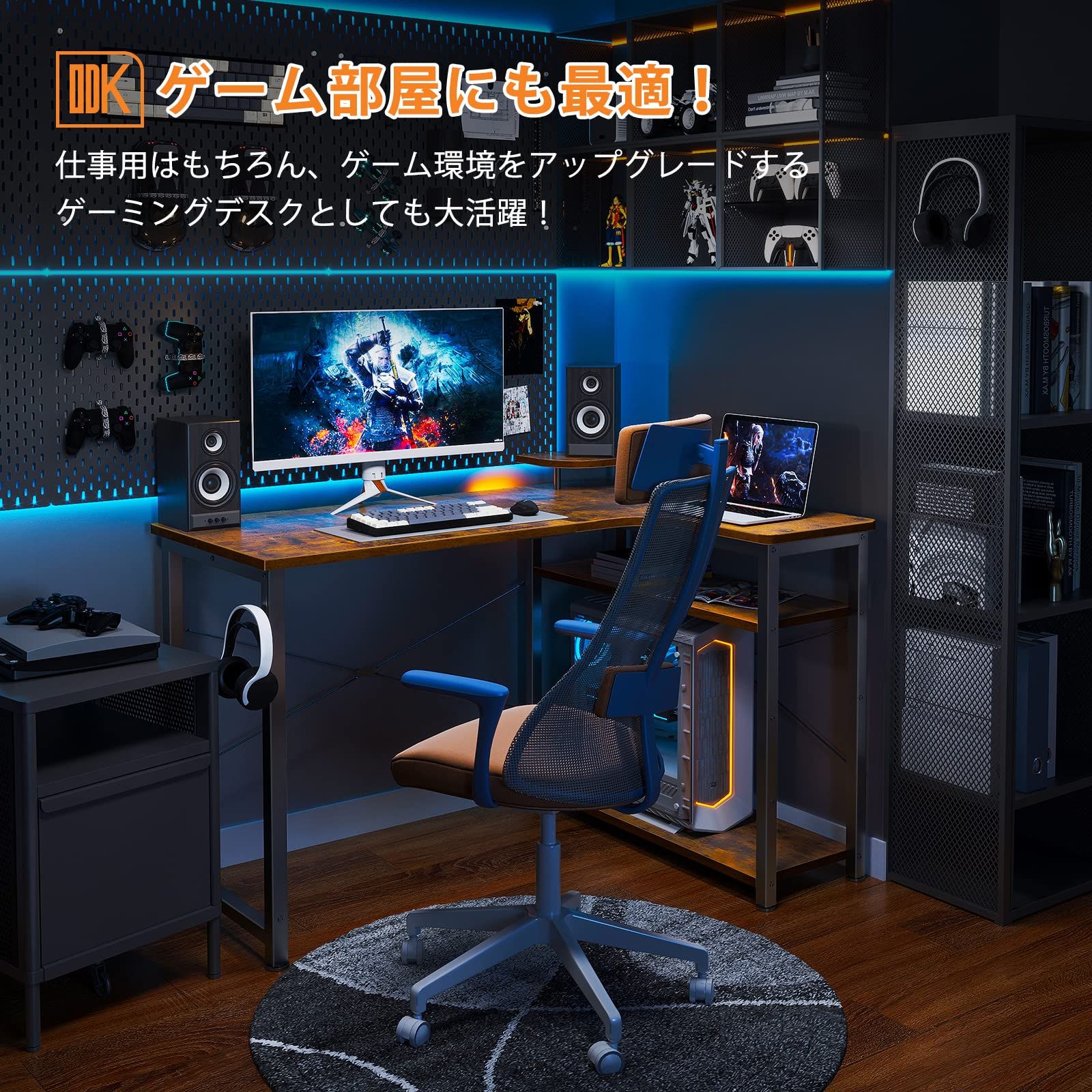 【ゲームと仕事両立】L字ゲーミングデスクは実用性が高く、ゲームプレイ、在宅勤務、書斎机、勉強机など様々なシーンで大活躍!モニター台を利用して目線をあげることで、作業時の姿勢を改善し、テレワークが快適になり、作業効率も格段に上がります。