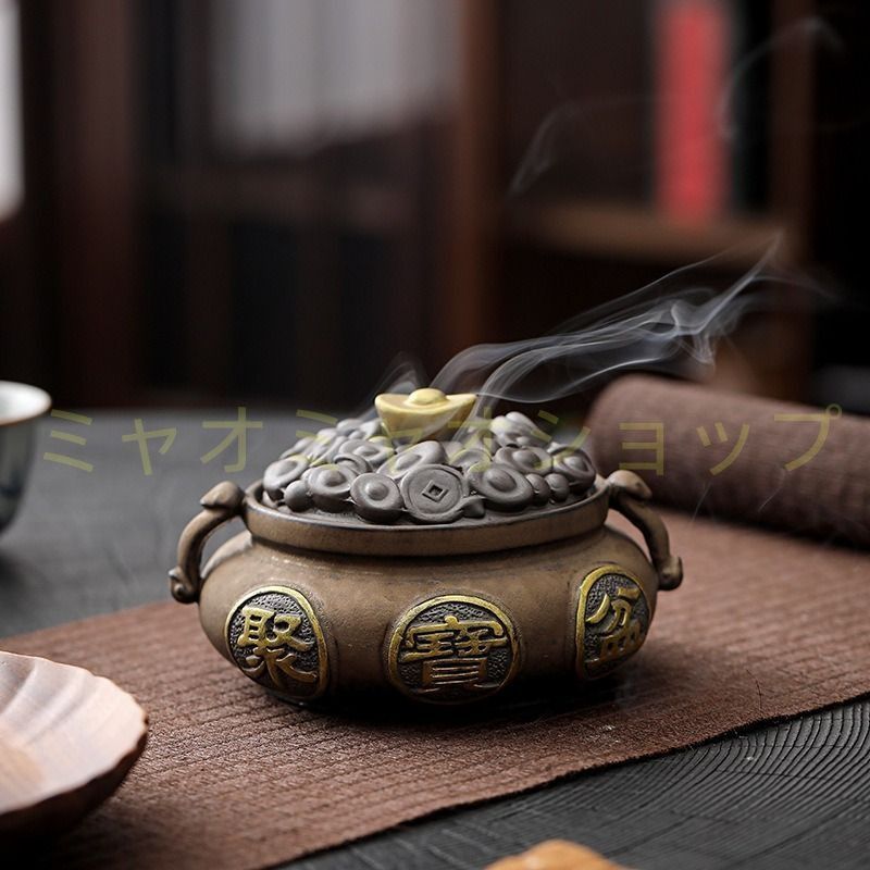 風水において財運を呼び込む象徴的なオブジェです。元宝は中国における古代の金貨であり、富と繁栄を象徴するとされています。この香炉は、壺の中に元宝が積み上げられた山の形を模したデザインが特徴です。煙が下に流れる逆流香炉の構造は、霧が山から湧き出るように見え、神秘的でありながらも美しい空間を作り出します。