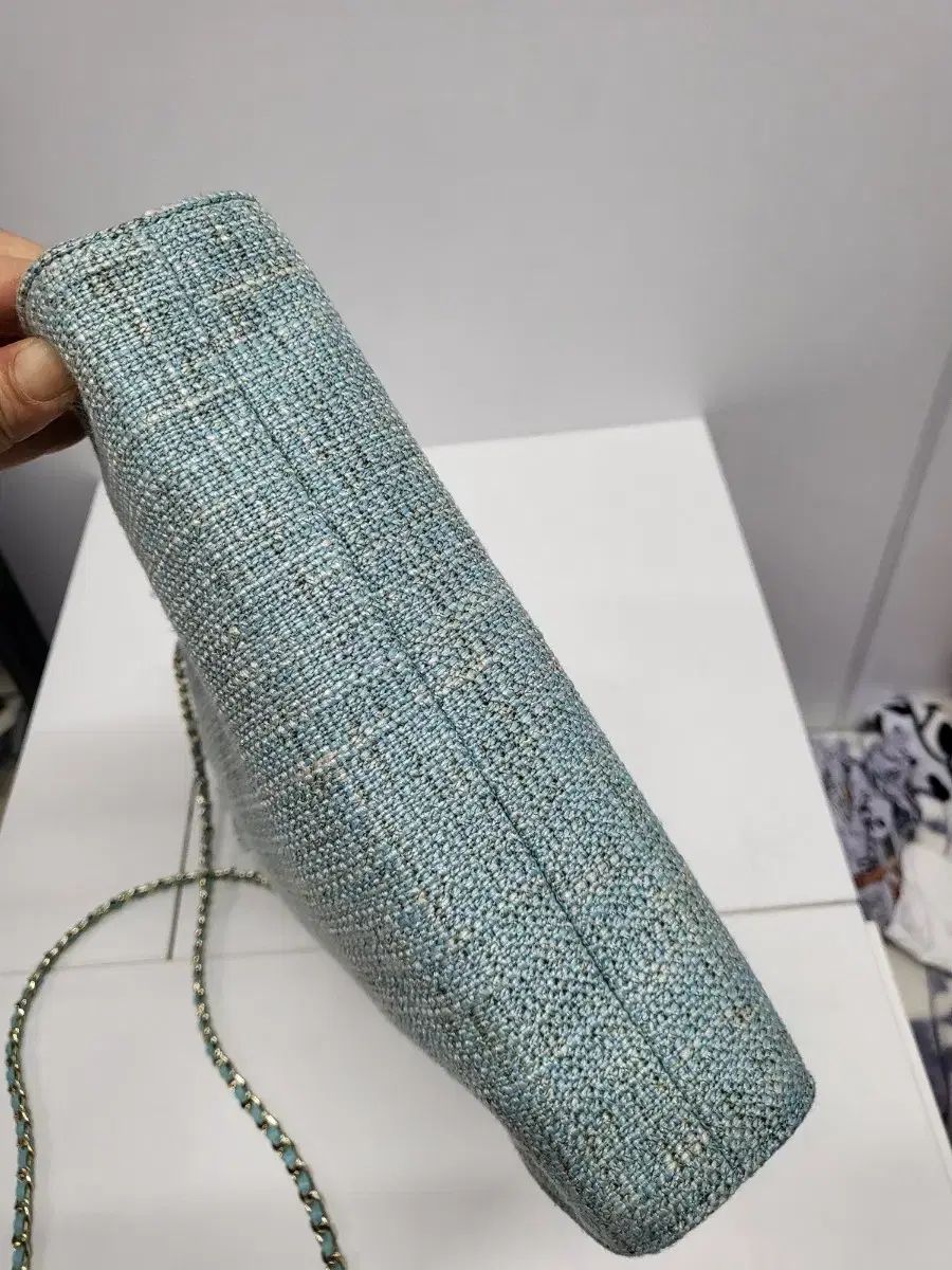 ポメルキャメル生地のツイードクロスボディバッグです。爽やかな水色と、ほのかなツイード織りが高級感があります。チェーンストラップがアクセントになっており、カジュアルでありながら洗練されたルックスになっています。ご不明な点がなければ、すぐに安心してお支払いいただけます!