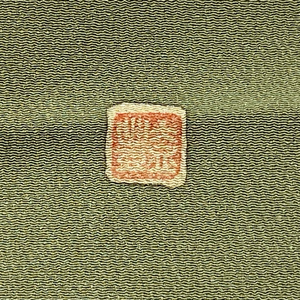 名古屋帯 秀品 落款 松竹梅 椿 縮緬 鶯色 正絹