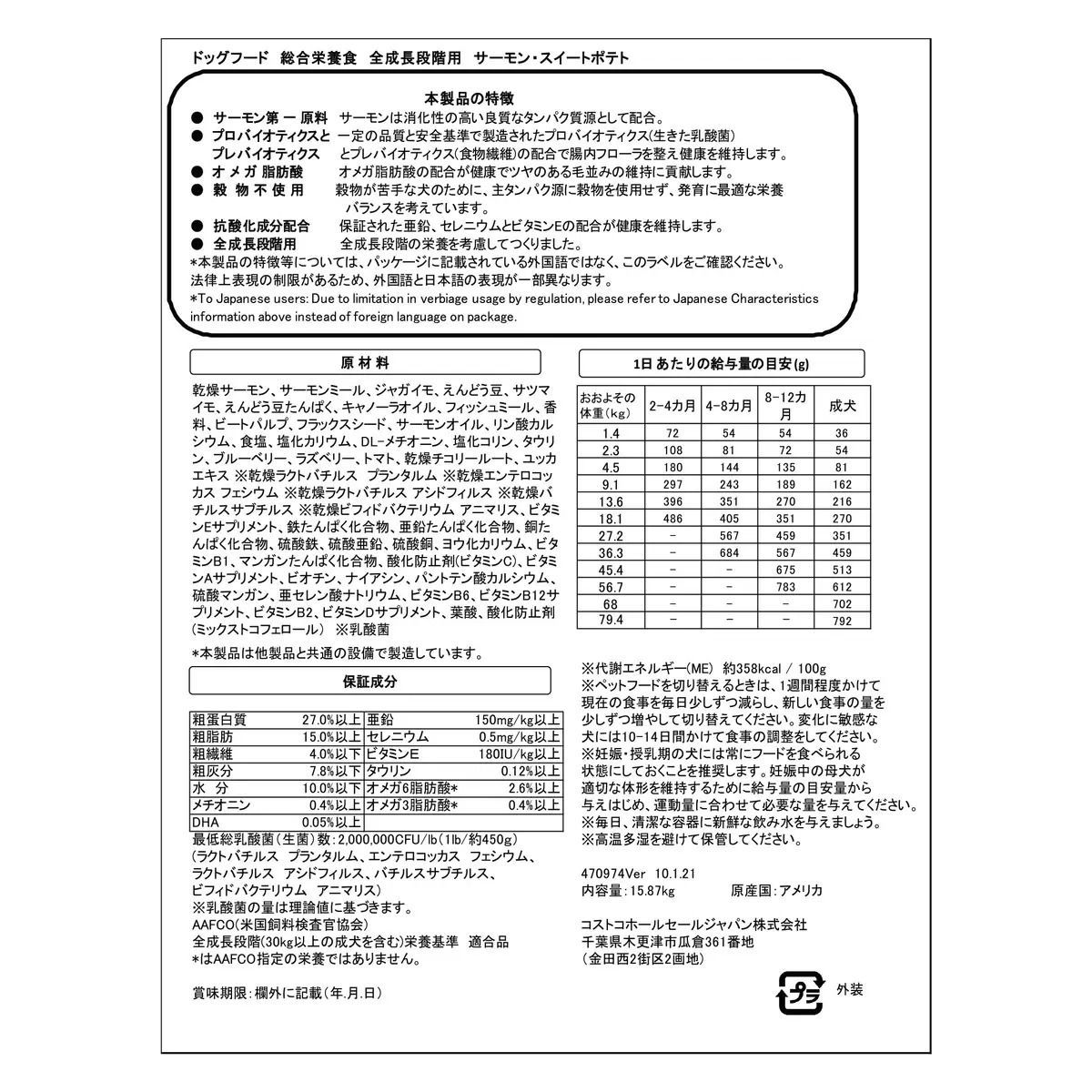 カークランドシグネチャーの成犬・子犬用サーモン、ポテトは良質なたんぱく質、オメガ脂肪酸が含まれており、健康的な生活をサポートします。