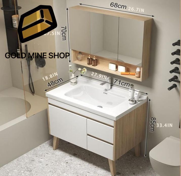 洗面化粧台 洗面台 扉 二 三面鏡 セラミック容器シンク冷水&温水蛇口 ロッカー付 全面収納 浴室の装飾 Size 71 cm
