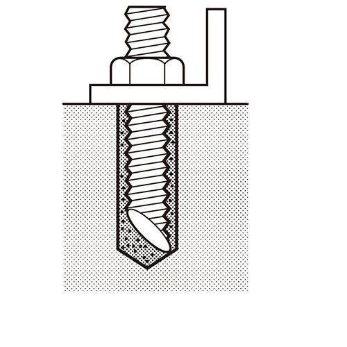 非スチレンモノマーの採用により、いやな臭いが減少。下穴に固着剤を入れ、ケミカル用長ねじなどをドリルで回転させて打込むと、化学変化によって硬化し、長ねじが固着します。引抜き強度のバラツキが少なく、耐震性、耐薬品性、耐蝕性に優れた接着力が得られます。変質、老化の心配がありません。接着系アンカーで強度が必要な場所に使用します。