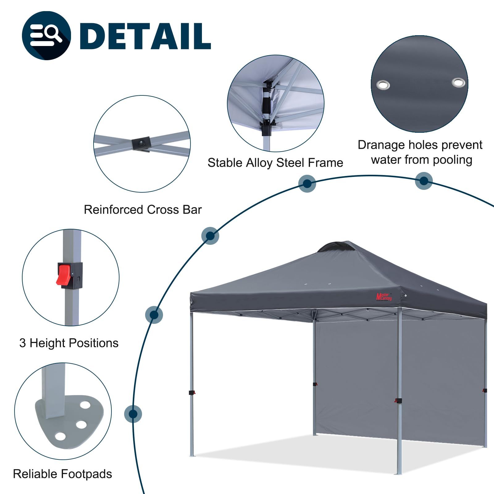 高品質素材フレーム:防錆加工の合金鋼製/生地:150Dポリエステル(シルバーコーティング)。粉体塗装された頑丈なフレームは錆に強く、特殊加工の生地は防水・UVカット機能を備えています。サイドシート付きで万全の天候対策!