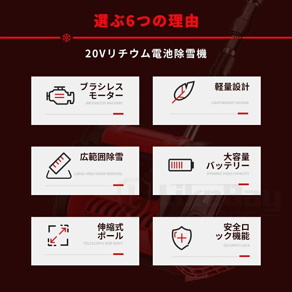 大容量バッテリー電動除雪機には大容量バッテリーが搭載されています。高性能バッテリーにより、長時間の作業が可能で、一回の充電で最大60分間稼働します。【安全性】電動除雪機のデザインはユーザーの安全を考慮しています。安全なスイッチボタンのデザインは、正しい操作時にのみ起動し、意外な傷害を防ぎます。また、ガソリン除雪機と比較して、電動除雪機のリスクは低く、住宅地域や商業地域での使用がより安全で信頼性があります。【環境にやさしく効率的】従来のガソリン除雪機と比較して、電動除雪機はより環境にやさしいです。排気ガスや有毒物質を排出せず、燃料も必要ありません。これにより、環境への影響が減少します。同時に、電動モーターの高い効率性能により、エネルギーの無駄を減少させ、持続可能な環境に優しい選択肢となります。【ポータブルで柔軟】製品の重量はわずか4kg 取り外し可能なハンドルデザインで 持ち運びや収納が簡単です 複雑な配線や電源に頼る必要がなく 充電式リチウム電池で駆動し 屋外のシーンでの使用に柔軟で便利です。【コントロールの安全性】人間化されたデザイン 滑り止めタイヤ 高さ調節可能で より安定した安全な操作を実現 また 収集袋が付属しており 雪を素早く収集し 清掃効率を向上させることができます 5重保護設計 より確実で信頼性の高い使用。【マルチシーン対応】電動スノースイーパーは 除雪と路面清掃のダブル機能を備えており 雪を取り除くだけでなく ゴミを清掃し 歩行の安全性を向上させることができます 近所 工場 学校などのシーンに適しており さまざまなユーザーのニーズを満たすことができます。