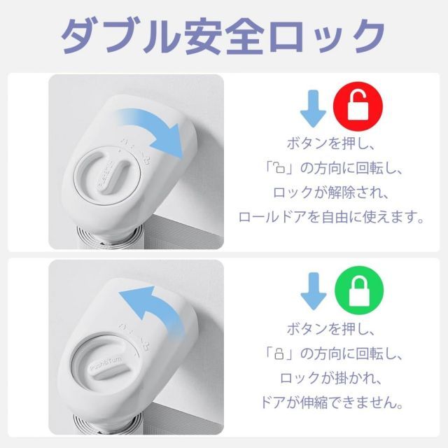 ❀❀安全ロック設計:安全ロック機能は操作が簡単で、片手でベビーゲートを開けることができます。ボタンを押し、ロックアイコンの方に回すと、メッシュゲートバーがロックされ、伸縮できなくなります。ロック解除アイコンの方に回すと、メッシュゲートバーのロックが解除され、通常通り伸縮できるようになります。ゲートバーをフックにかけた状態で、セーフティロックをロック位置までひねると、メッシュ生地が動かなくなります。幼児が誤って触れるのを防ぎます。