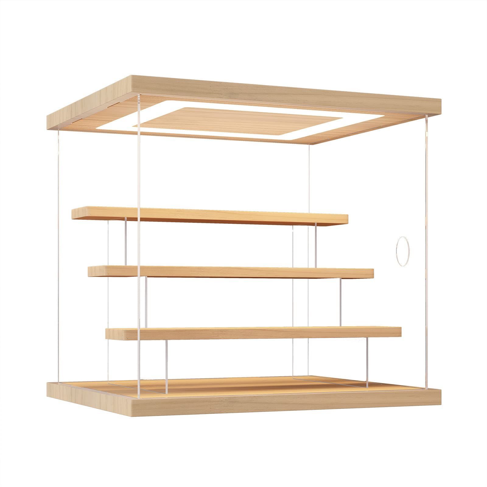 LEDライト付き_幅30×奥行25×高さ27cm KUKERフィギュアケース コレクションケース アクリルケース LED照明付き ディスプレイケース ショーケース クリアケース 展示ケース ひな壇 扉付き 木製 組み立て簡単 手袋 防汚れ クリーニングクロス付き(LEDホワイト・ひな壇3段・30×25×27cm)_x000D_