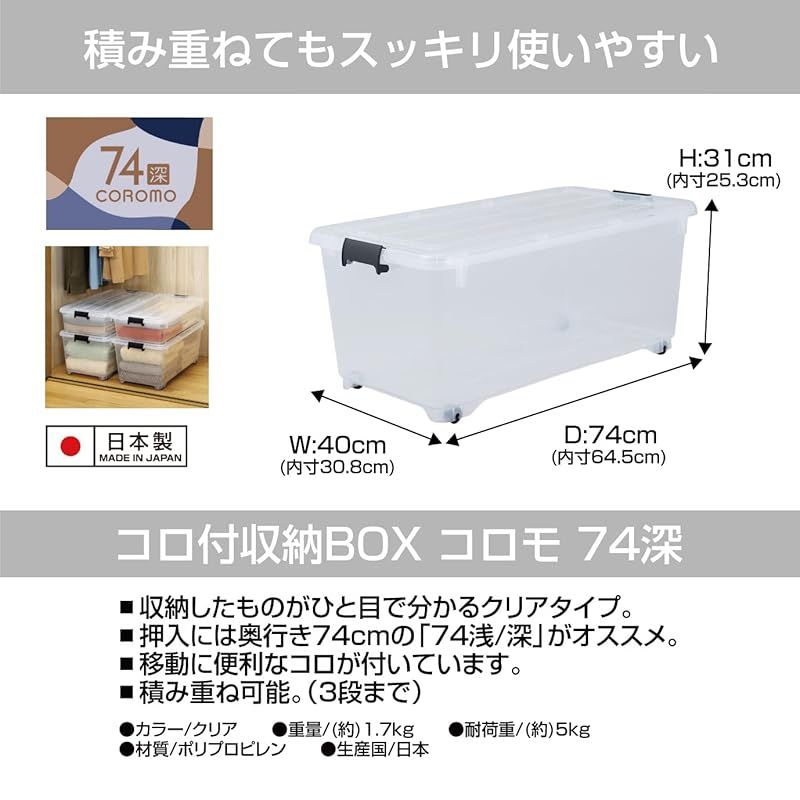 JEJアステージ JEJ Astage 収納ボックス 衣類収納 コロモ深型 奥行74 cmタイプ クリア フタ コロ付き クローゼット 押入れ 幅40 高さ31 cm セット 1