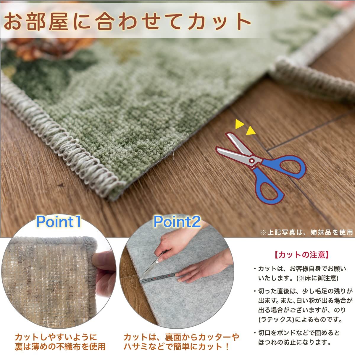 【ご注意】<においに関して>ご使用当初、裏面に塗られる仕上げの接着塗料(ラテックス剤)のにおいがする場合がございます。人体への影響はありませんが、においに敏感の方や、ご心配の方はご理解の上ご購入お願いいたします。開封後常温のもとで気化(蒸発)するため、においはご使用につれてなくなります。気になる場合は風通しの良いところで陰干ししていただきますと、より早く解消されます。/ <サイズに関して>カーペットの製法上、表示サイズより0~3%の誤差がございます。 / 置き敷きには滑り止めシート等をご使用ください。(カーペット自体が滑り転倒する可能性がございます。)/ 商品の性質上、最初のうちは折りしわや遊び毛も多少発生いたしますが、ご使用になるにつれてある程度減少します。/ ※いずれも商品の初期不良ではございませんので返品・交換は行なっておりません。