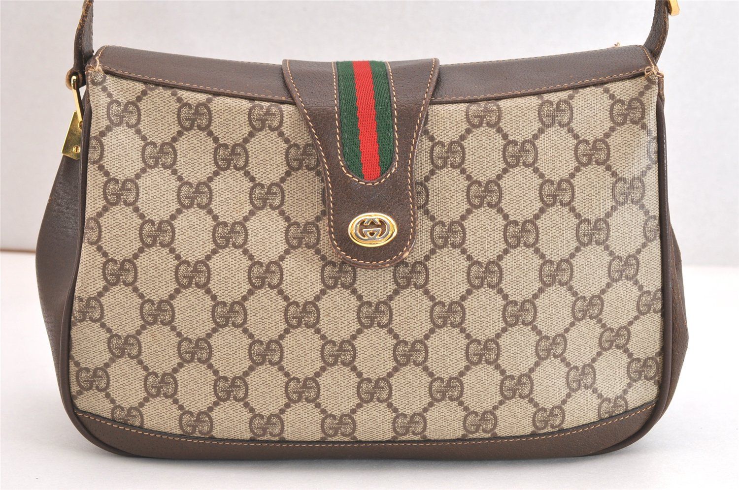 GUCCI グッチ ウェブ シェリーライン ショルダーハンドバッグ GGピーブイシー レザー ブラウン 4052 N