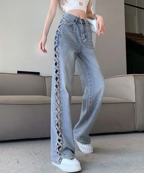 大胆なサイド編み上げデザインが目を引く、個性派デニムパンツ。