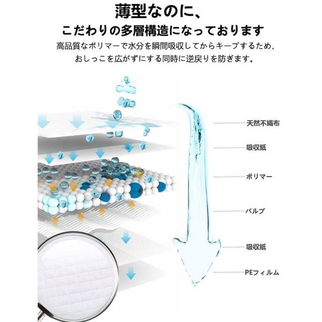 本商品ハニーケアペットシーツは薄型ですが、多層構造を採用したため、オシッコをたっぷり吸収いただけます。