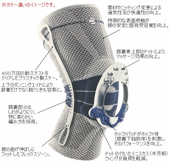 膝関節周辺部の痛みや不安定感に全般的に使用できる膝サポーター。膝関節の形状に沿って編まれたニット編みとシリコーンパッドが膝関節を安定化させるとともにマッサージ効果を促します。