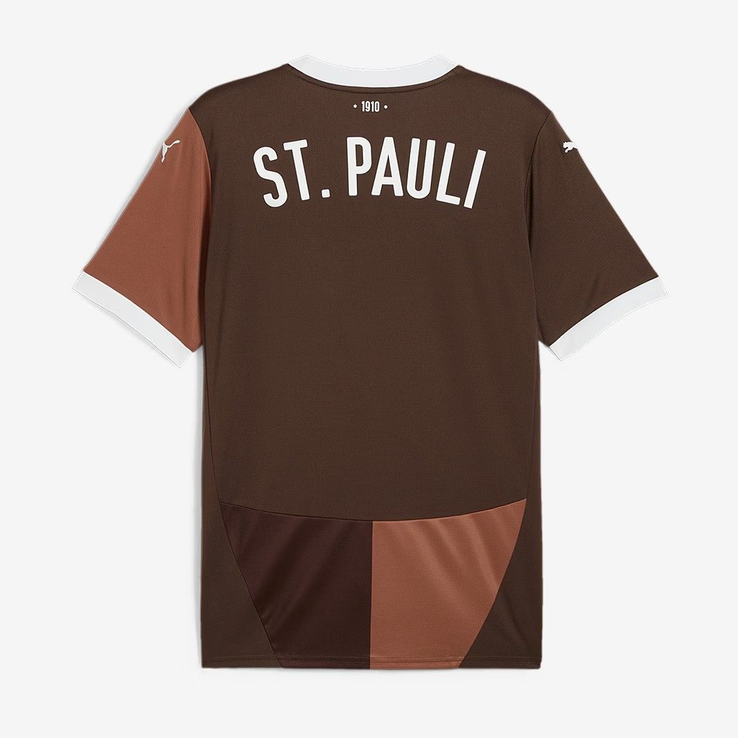 ドイツの強豪、FCザンクトパウリの2024/2025シーズン、ホームシャツです。エスプレッソブラウン/プーマホワイトのカラーリングで、クラブがブンデスリーガに復帰するシーズンを記念し、1991/92シーズンのキットに敬意を表した大胆なデザインが特徴です。