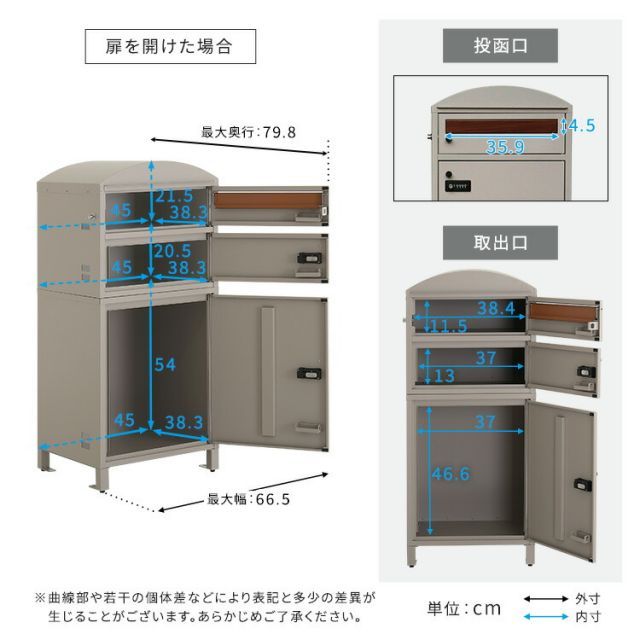 宅配ボックスポスト一体型3段ダイヤル式鍵付き置き型幅45cm奥行42cm高さ105cmほぼ完成品(脚のみ取付)ゼロリターンキースチール置き配ボックス宅配ポスト宅配ロッカー郵便受けおしゃれ玄関屋外木目調ダークグレーライトベージュアジャスター付き宅配ボックスポストダイヤルシリンダープッシュキー郵便ゆうパケットネコポス印鑑ケースアンカーボルト防さび家具エクステリアポスト家庭用宅配BOX戸建てラウンド型配達ボックス通販受け取りボックス荷物受け取りボックス郵便ポストスタンドタイプ置き型ポスト新聞受け玄関ポスト宅配ボックス付扉全開時幅66.5×奥行79.8cm宅配便通信販売小包不在受け取り留守受取再配達防止非対面盗難防止複数投函A4対応レターパック対応メール便対応100サイズが入る2Lペットボトル6本入りケースが入る新生活玄関エントランス庭ガーデン玄関ポーチシンプルモダンかわいいシック北欧風ナチュラルさびにくい傷に強いサビに強いガルバナイズド処理ガルバリウム鋼板印鑑収納印鑑ケース付きダイヤル錠プッシュキーワンプッシュ施錠スペアキー付きスリット窓付きアンカーボルト付きガタツキ防止アースカラー