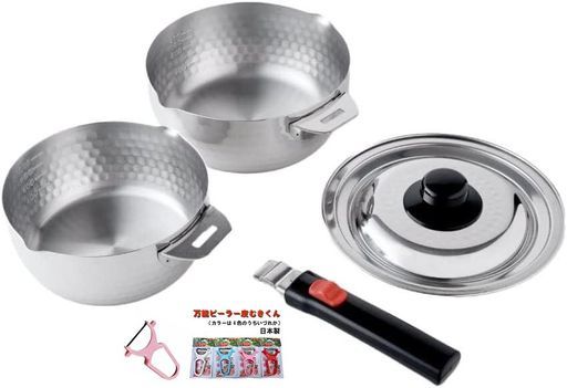 アーネスト社製A-77864、万能ピーラー皮むきくん付き特別セットです。雪平鍋18cm、16cm:ステンレス鋼(クロム18%)蓋18・16cm兼用:ステンレス鋼、ナイロンハンドル:ナイロン、ステンレス鋼