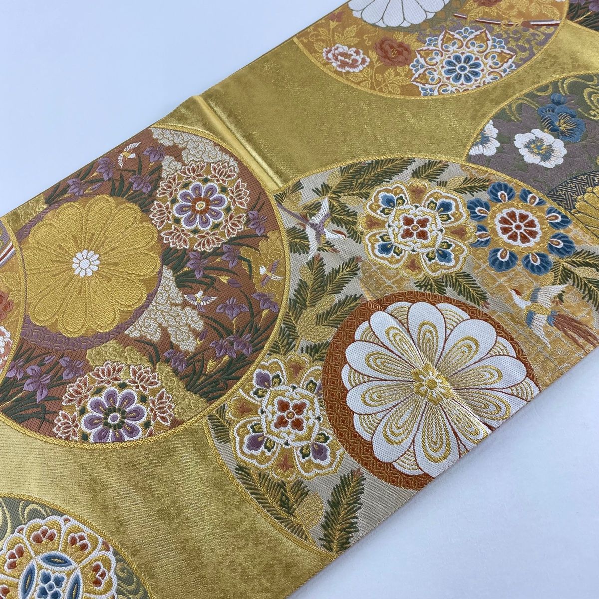 袋帯 秀品 関西仕立て 花鳥 丸文 箔 金糸 金色 六通 正絹