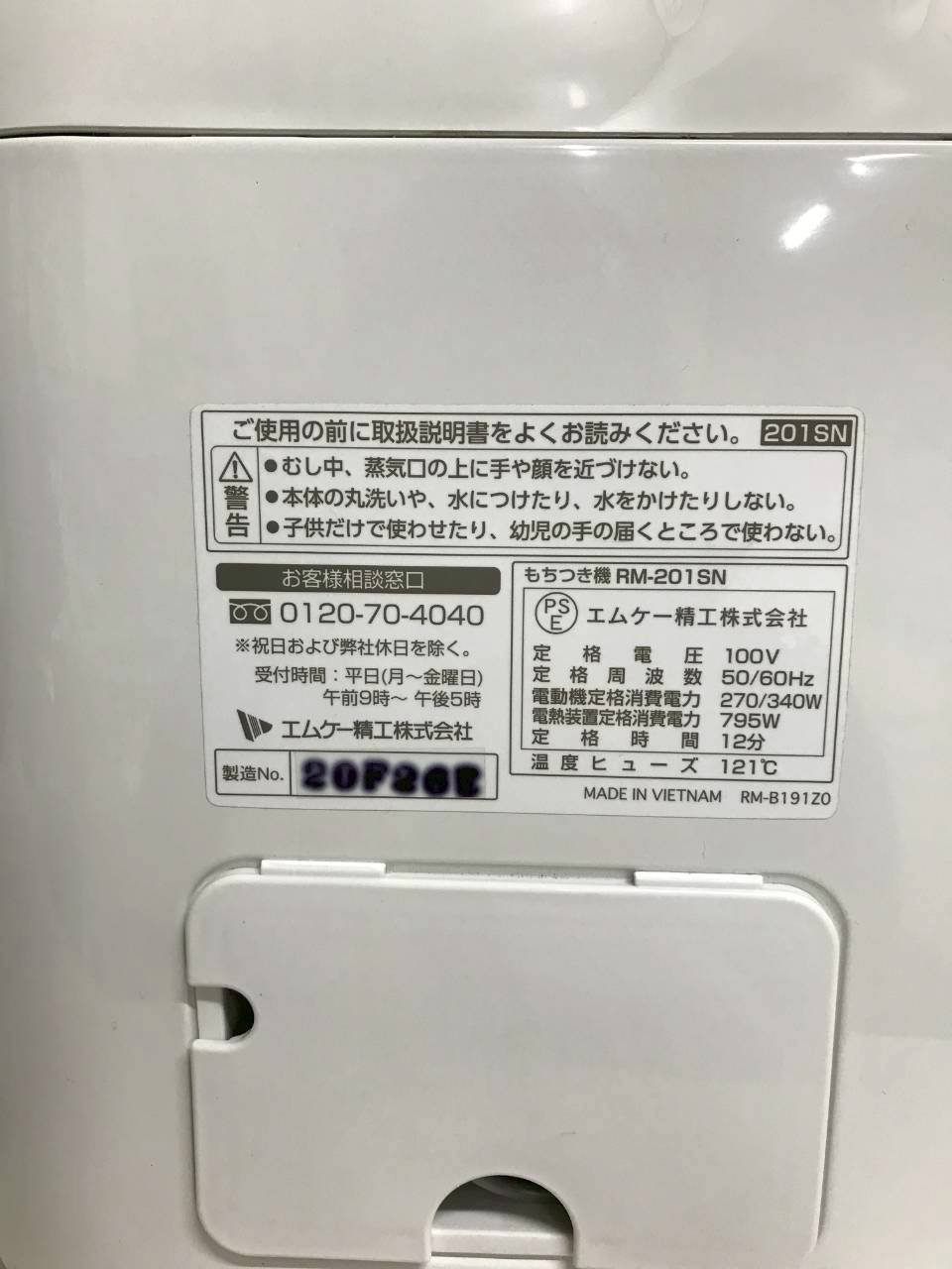 北見市発 エムケー精工 もちつき機 RM-201 SN 白