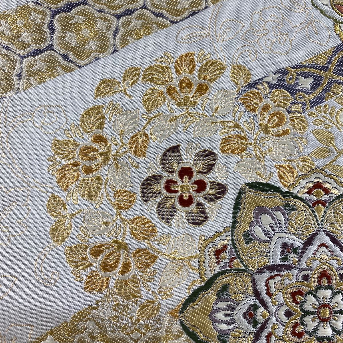 袋帯 秀品 華文 熨斗 金糸 箔 灰白 六通 正絹