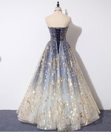 チュールに金のプリントが美しいロングドレス。たっぷりとしたレモン色のサテン地の上に、白のチュールと金の筆書きのようなプリントをあしらった灰青色のチュールをたっぷりと重ねたデザイン性のあるスタイルがとても魅力的です。肩紐のないベアタイプの胸元はしっかりとした固めのチュールを使用し、ずり落ちをカバー。豪華かつ上品で全体的に優しい感じに仕上げています。背中は腰下まで編紐で縛るタイプなので、紐の締め具合でバストサイズとウエストサイズを調整できます。シックでゴージャス。華やかなパーティシーンにぴったりの一着です。背中腰まで編み紐掛け。ファスナーなし。胸パット付き。