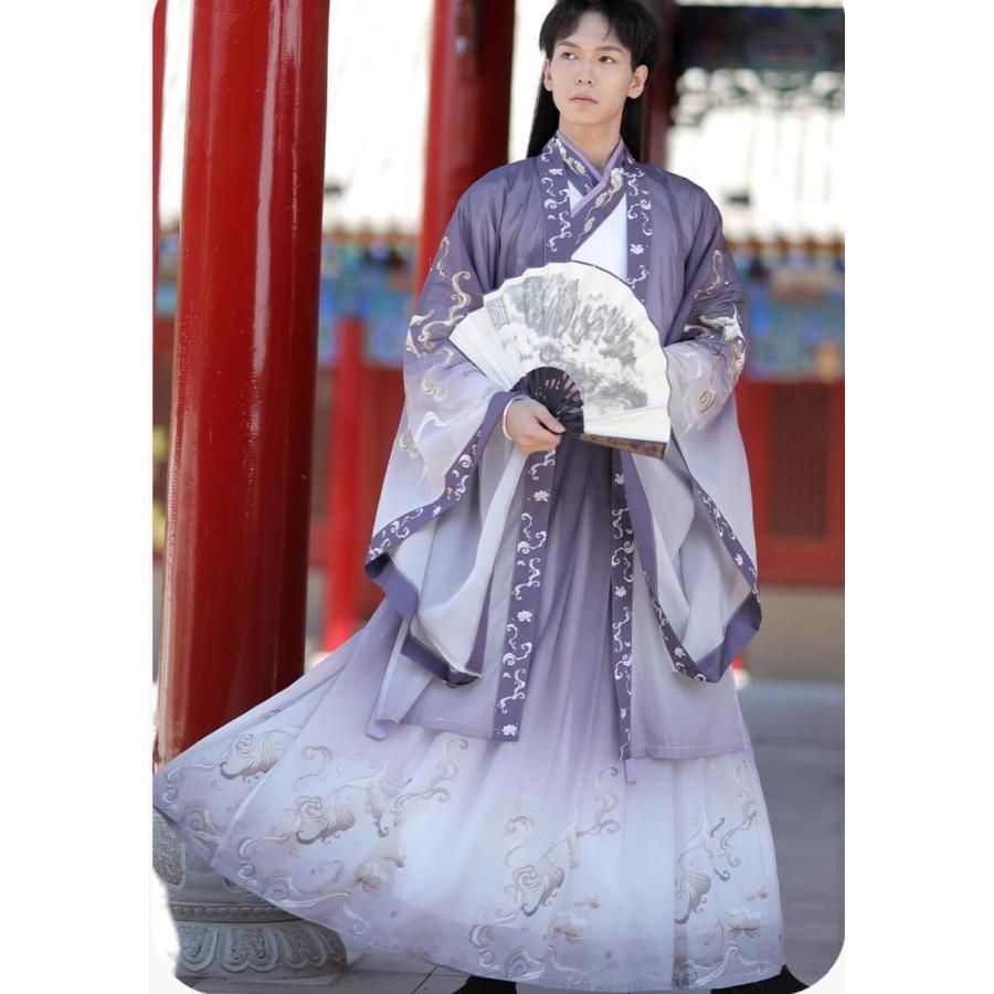 高品質 紫 グラデーション 漢服 3点セット 大人 男女兼用 おしゃれ 交差襟 ロング丈羽織付き 振り袖 飄逸 メンズ レディース チャイナ服 古代古典