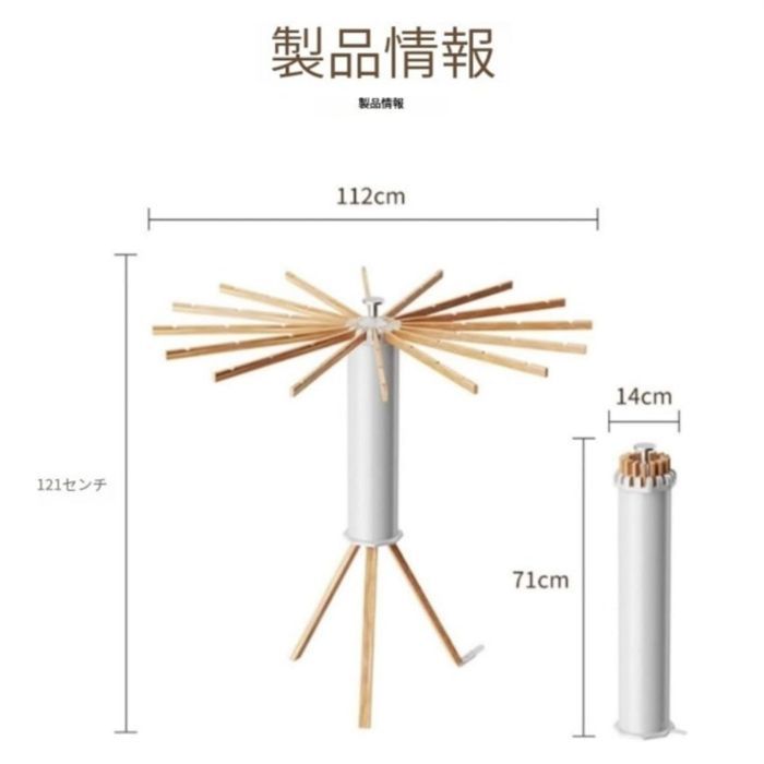 【折りたたみ洗濯物干しの情報】展開時サイズ(約):直径112cm×高さ121cm 収納時サイズ(約):幅14cm×奥行14cm×高さ71cm 重量(約):3.2kg 耐荷重(約):20kg