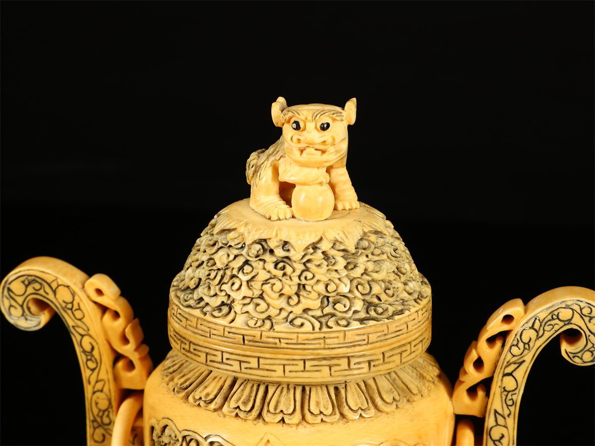 唐物 清代 東洋彫刻 龍紋 香炉 台付高17㎝ 幅15㎝ Ng 1299